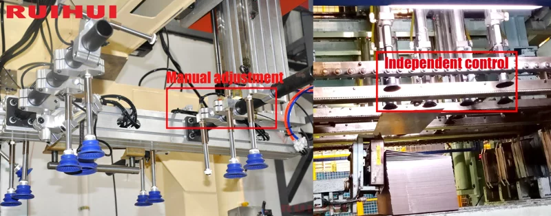 In a truss destacking system, the suction cup positions are fixed and require manual adjustment. In a top-suction destacking system, each suction cup is independent and controlled by its own cylinder. The suction cup positions can be adjusted automatically, and the system includes parameter memory, allowing flexible use for products of different shapes.