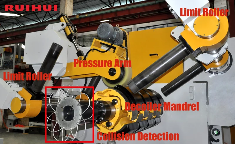 (This image shows the decoiler mandrel, collision detection, limit roller, pressure arm.)
