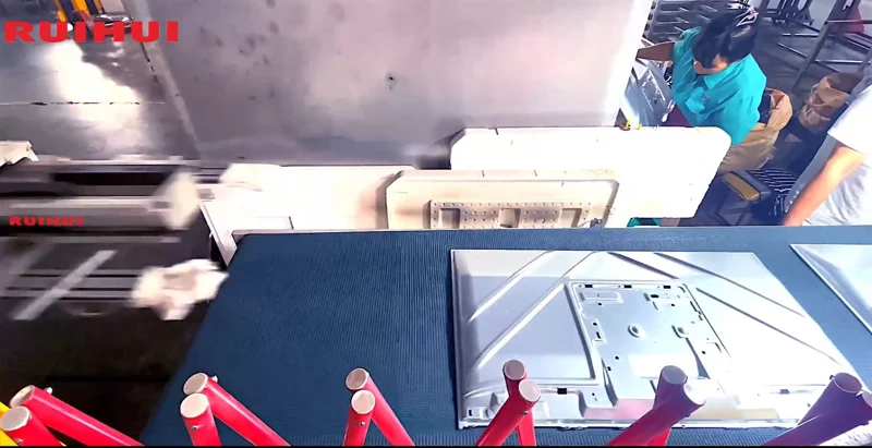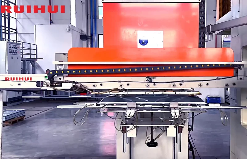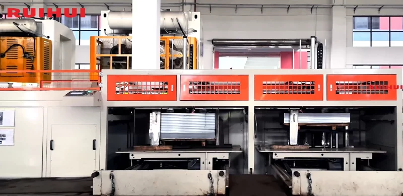 Materials are transported via destacking trolleys, then magnetically separated from the upper layers of sheets, and finally picked up and transferred by robotic arms. To improve production efficiency, this production line is typically equipped with a dual destacking system.