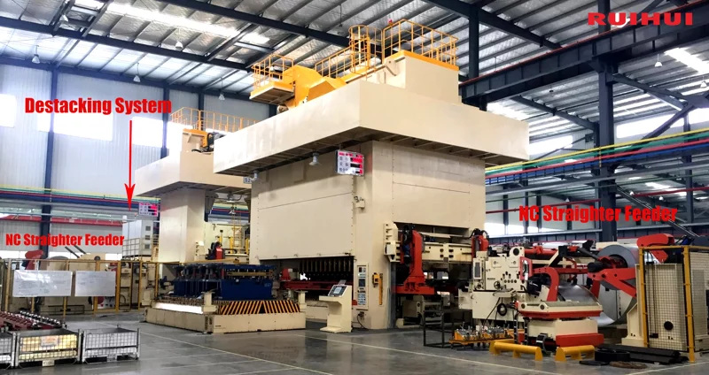 The NC straightener feeder is used for uncoiling, leveling, and feeding the material. The destacking system is a dual-station overhead-type design, which helps save floor space. The movable conveyor can be positioned in different locations according to the production flow.