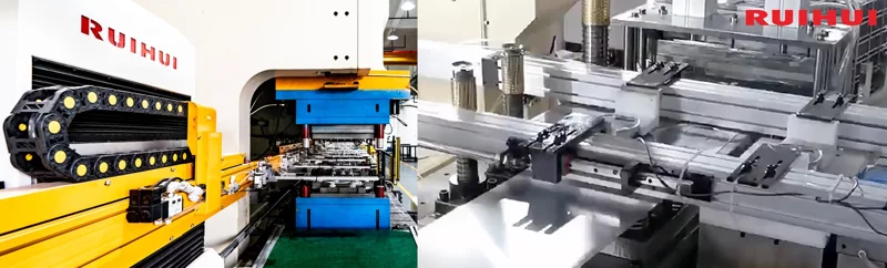 (Here is the 2-axis transfer stamping line. You can see an NC straightener feeder with oscillating function. After blanking, the 2-axis transfer system further transports the workpiece for stamping.)